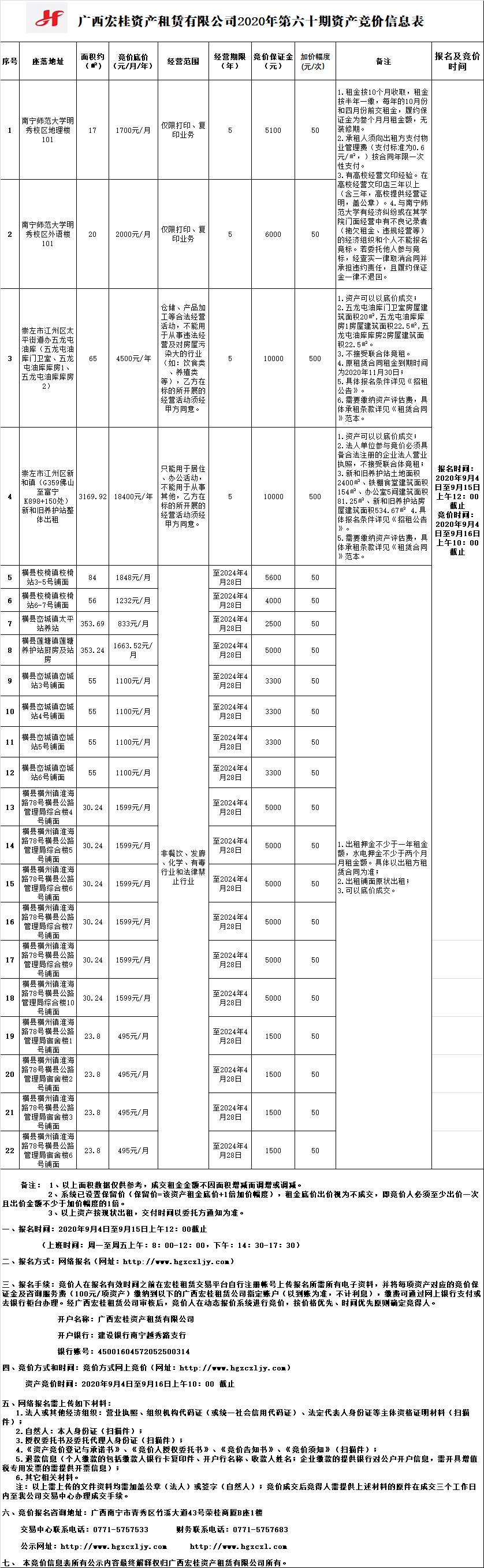 广西宏桂资产租赁有限公司2020年第六十期资产竞价信息表